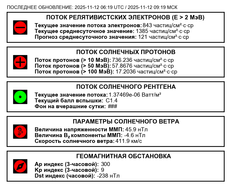 Ожидается, что с 12 по 19 ноября солнечная активность будет меняться от умеренной до высокой, а геомагнитная обстановка — от слабовозмущенной до возмущенной. Очень высокая геомагнитная активность ожидается 12-13 ноября.