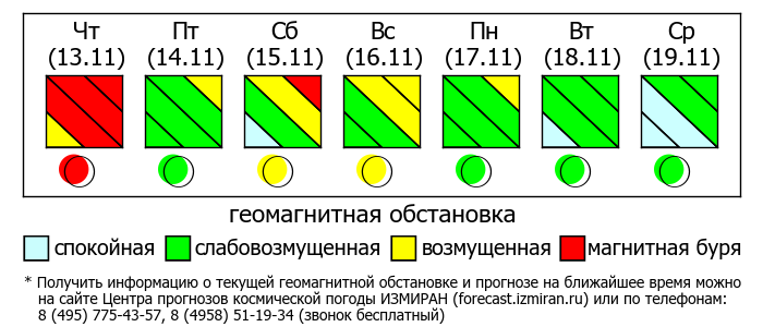 Cолнечная активность с 4 по 11 ноября менялась от умеренной до высокой, а геомагнитная обстановка — от спокойной до возмущенной. 5-6 ноября зарегистрирована большая магнитная буря, 6-7 ноября — малая, а 8 ноября — умеренная.